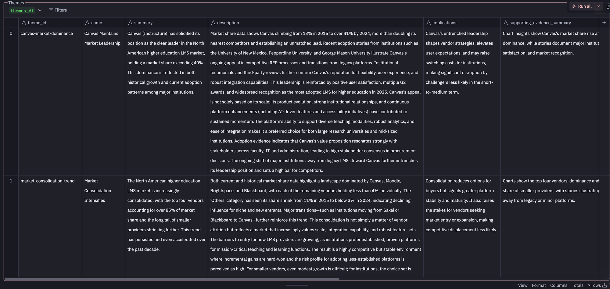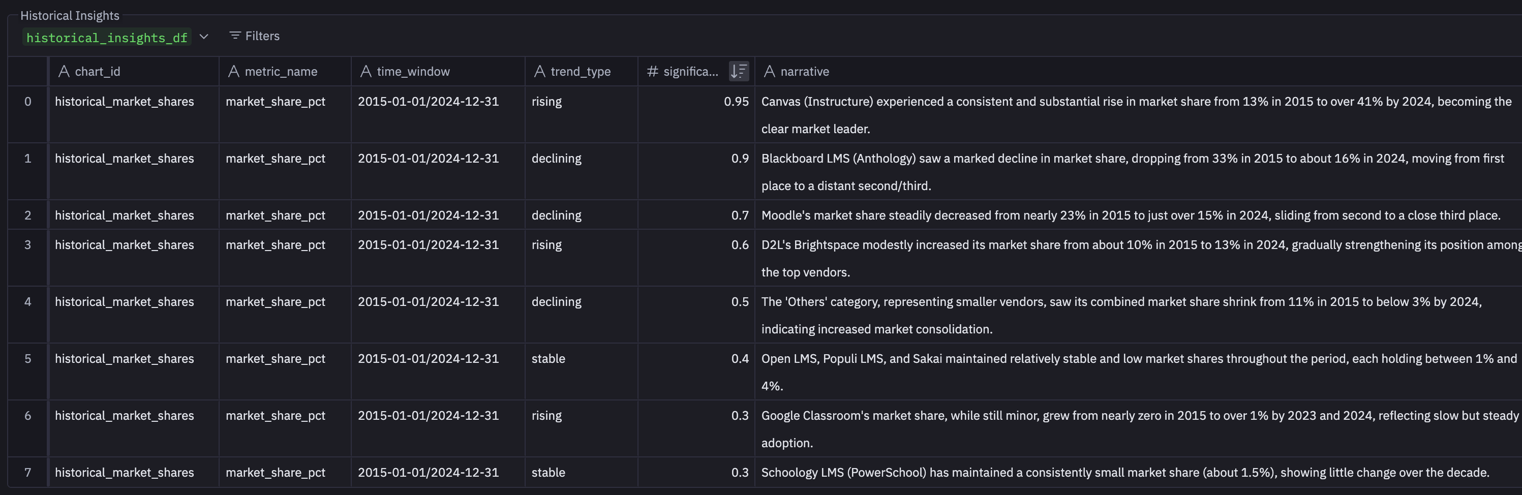 This example demonstrates how the system creates value by connecting quantitative market position data with qualitative market signals, generating strategic intelligence that requires both data types to produce.