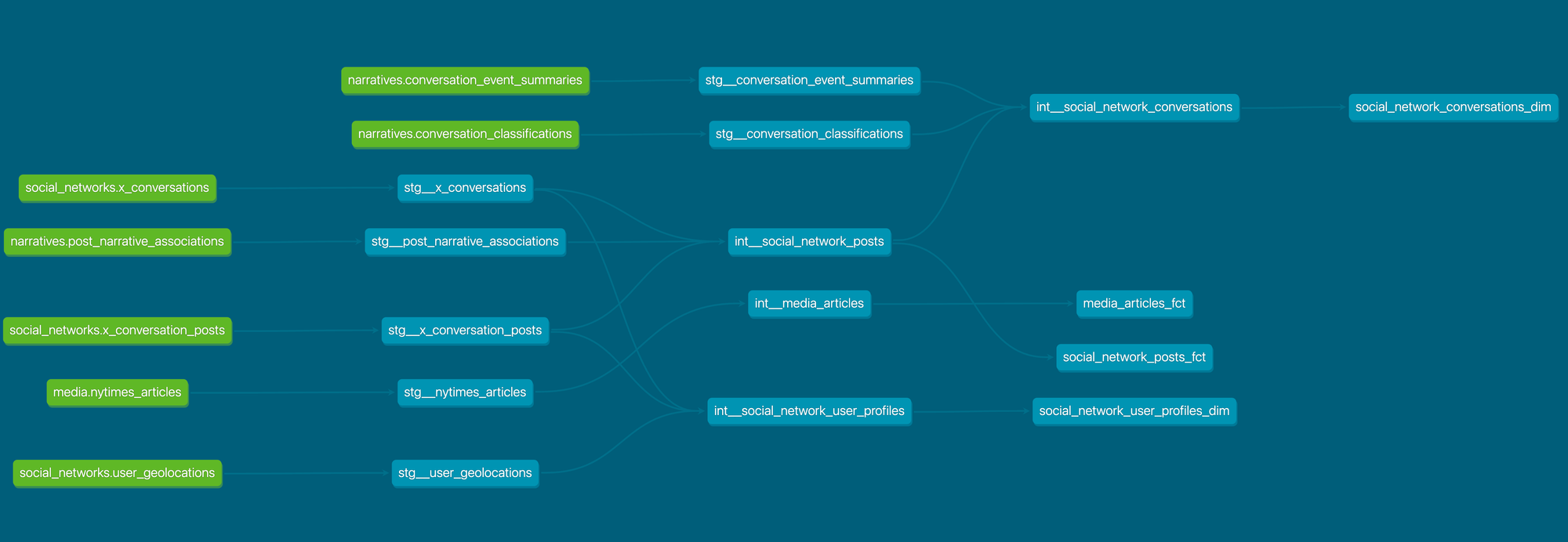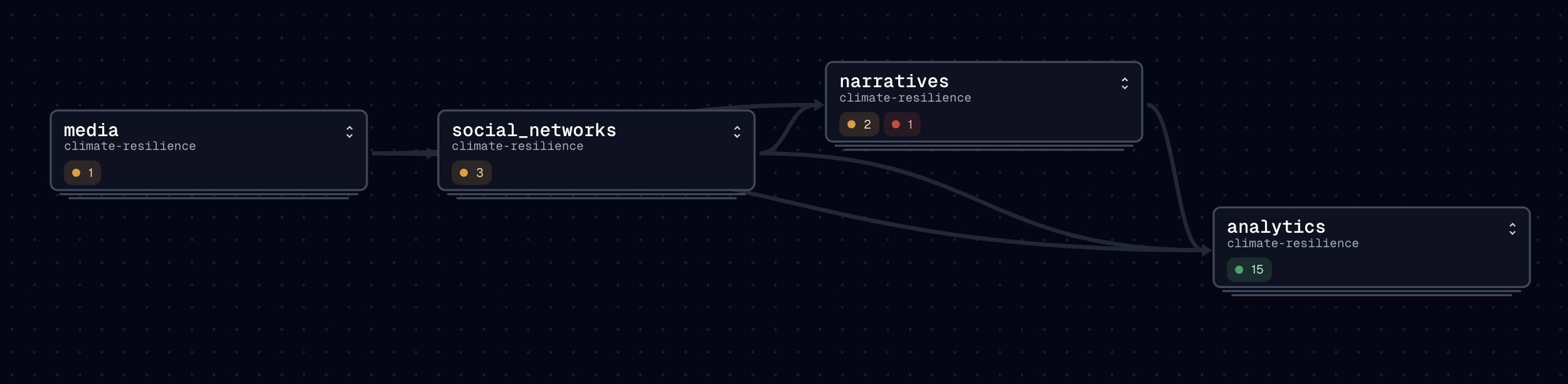 media: The climate-related articles being sourced.social_networks: The conversations that refer to the articles above.narratives: The classification of conversations and posts into discourse types and narratives.analytics: The dimensional representation of those assets for reporting purposes.