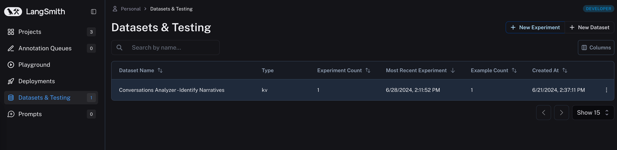 If we head to LangSmith, we see that our dataset now has an experiment against it.