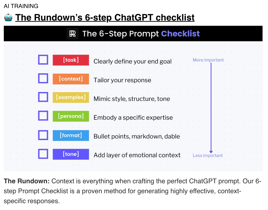 Manual Frameworks: These involve human intuition and creativity to craft prompts. They rely heavily on trial and error, iterative adjustments, and qualitative assessments. Here is an example of a checklist shared in a widely circulating AI newsletter.