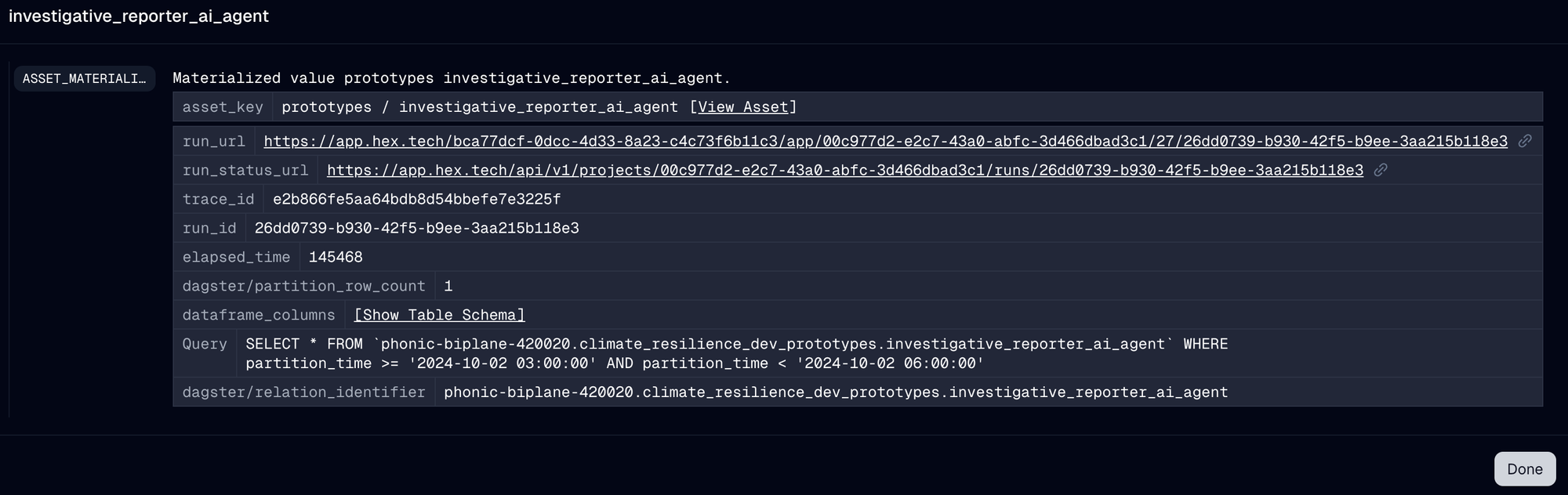 I can then use the Hex Resource within a Dagster asset to run the investigative report generation: