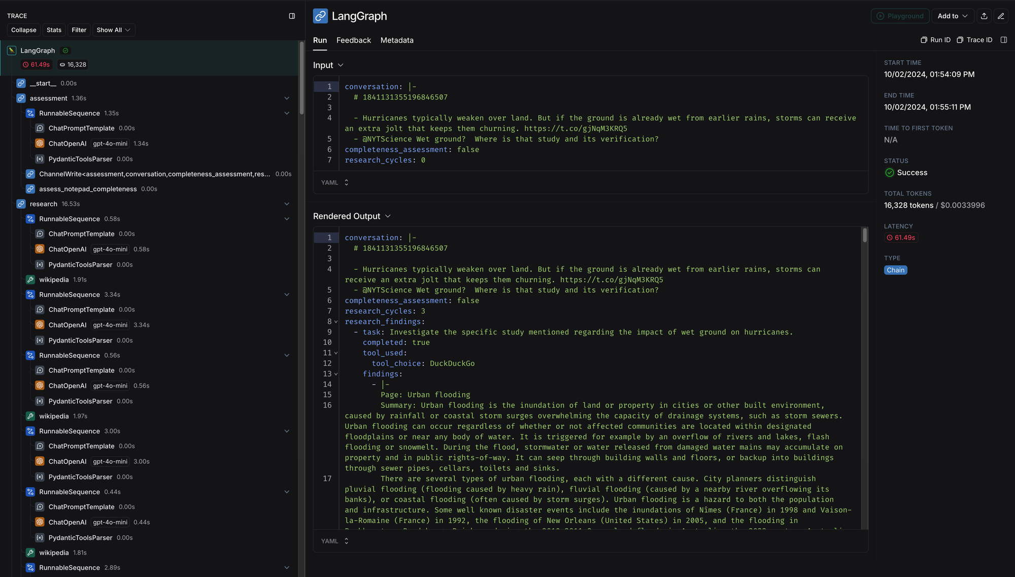 Research findings revealed that while there is a general understanding of the dynamics between hurricanes and environmental conditions, specific studies verifying the claim that hurricanes can sustain strength over wet ground are limited. The investigations included an analysis of urban flooding types and their causes, with additional insights from historical data on hurricanes, particularly in Hawaii, and the impact of climate change on weather patterns. However, a definitive study supporting the hurricane wet ground interaction claim remains elusive, emphasizing the need for further focused research in this area.Monitoring the agent’s performance in LangSmith helps optimize the research cycles and track token usage and cost metrics. This helps ensure the AI agent is efficient and doesn’t perform redundant tasks.