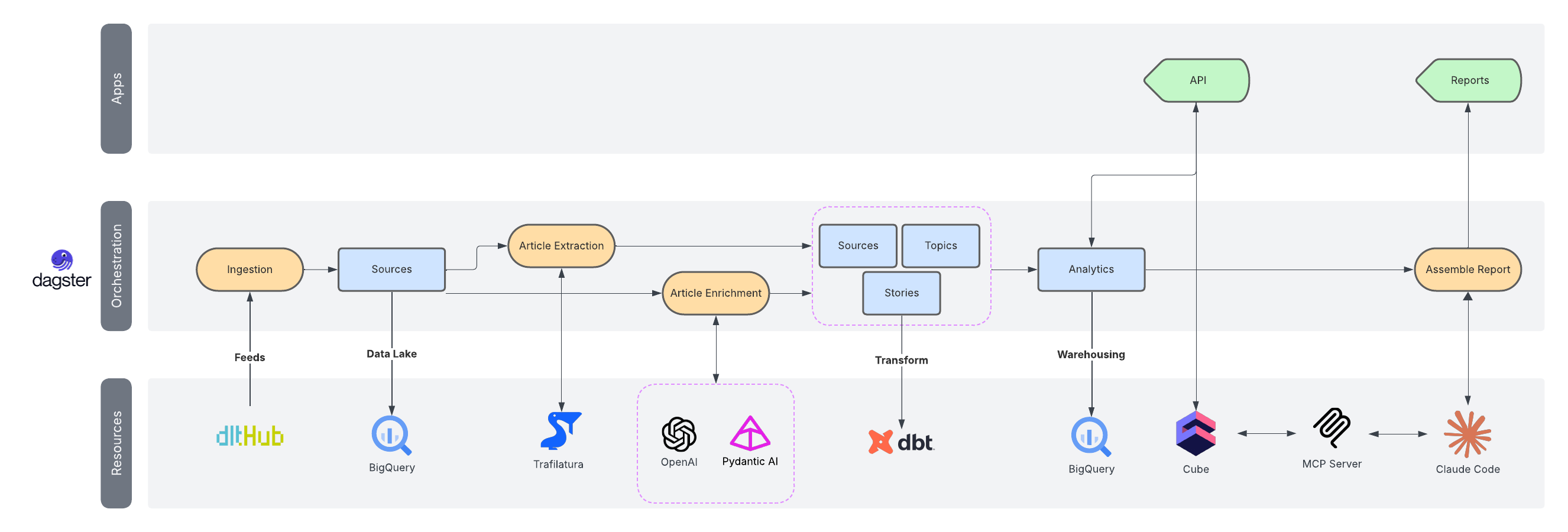 The platform looks simple from the outside, but it’s made of a clear set of layers that each solve their own problem. It combines ingestion pipelines, article extraction, LLM-based enrichment, a warehouse, a semantic layer, and a conversational interface that ties everything together.