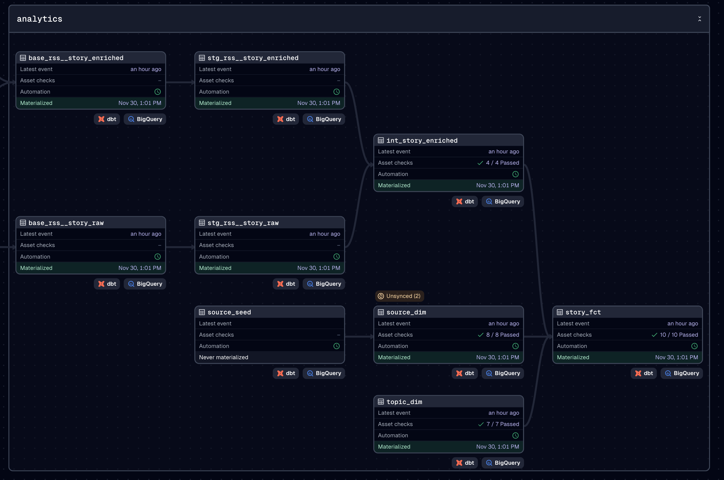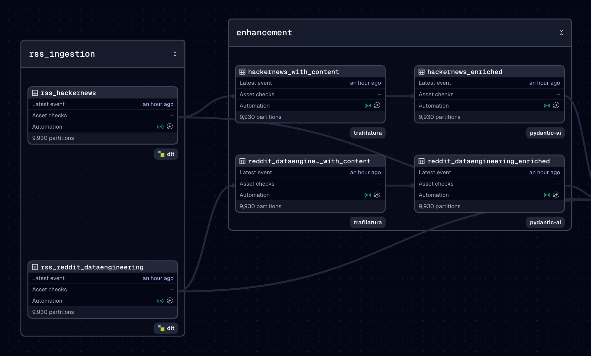 To fix this, the system continuously collects stories on its own. I use dlt for ingestion because it’s simple, open source, and doesn’t create heavy maintenance overhead. Dagster runs the pipelines. Adding a new source is just a YAML configuration change.