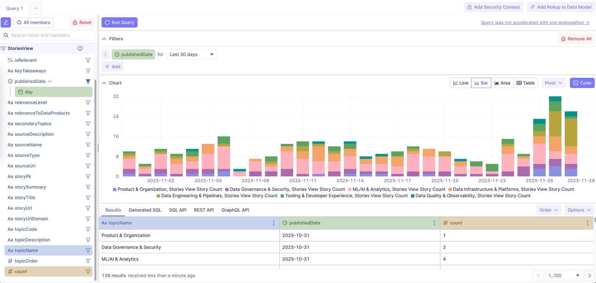 Structured text is helpful, but not enough on its own. I need models I can query over time, by topic, by source type, or across all stories.