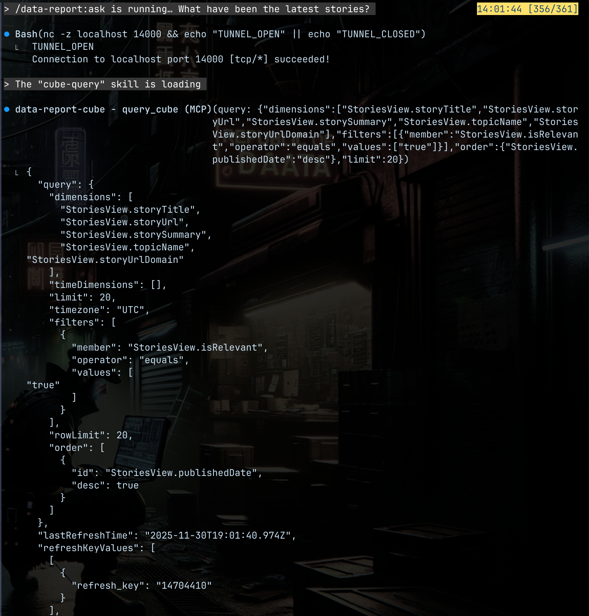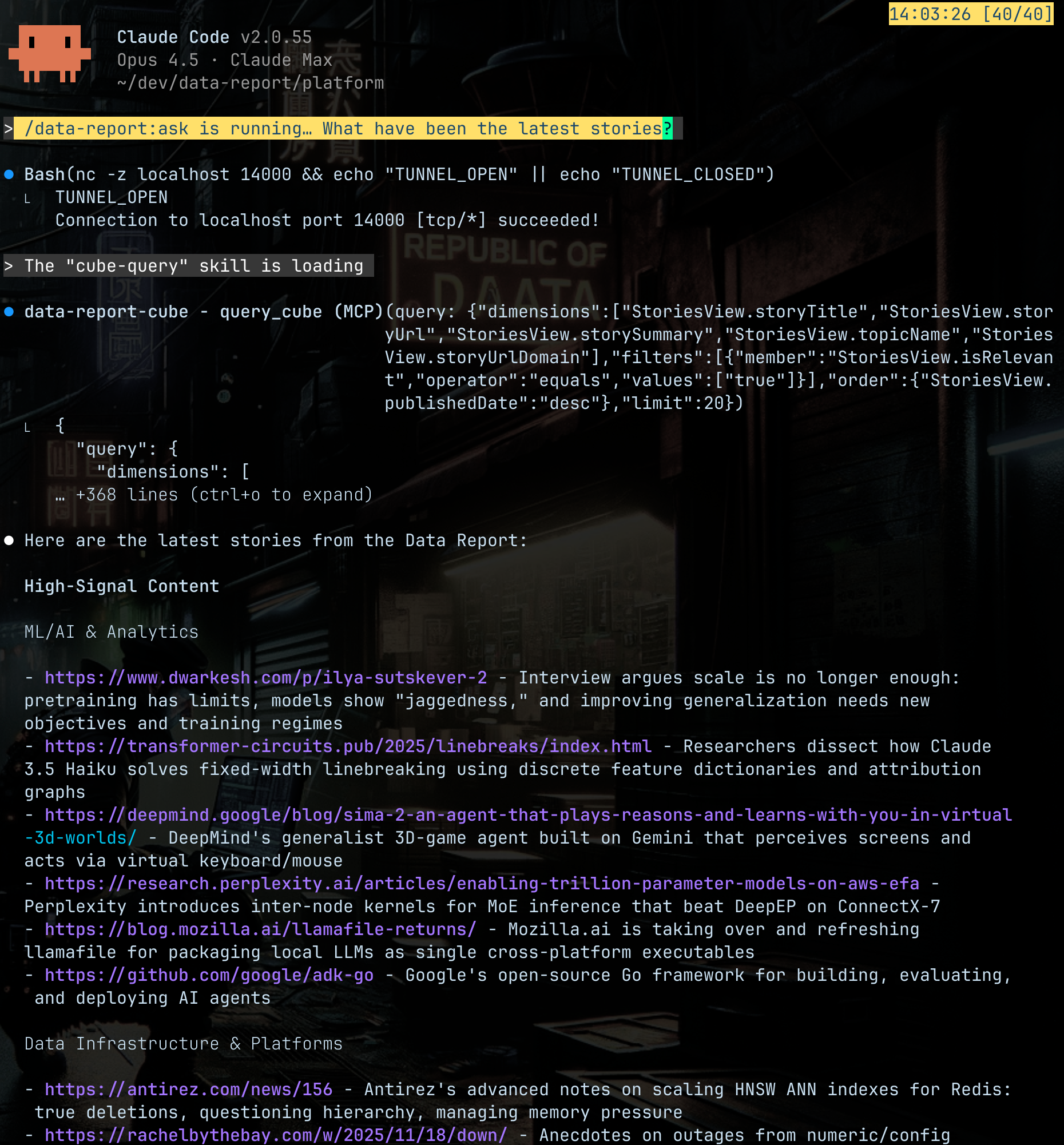 So I packaged the whole stack into a Claude Code plugin. From my terminal, I can run one command and start asking questions. The plugin connects through SSH, pulls all the semantic context, and handles the details behind the scenes.