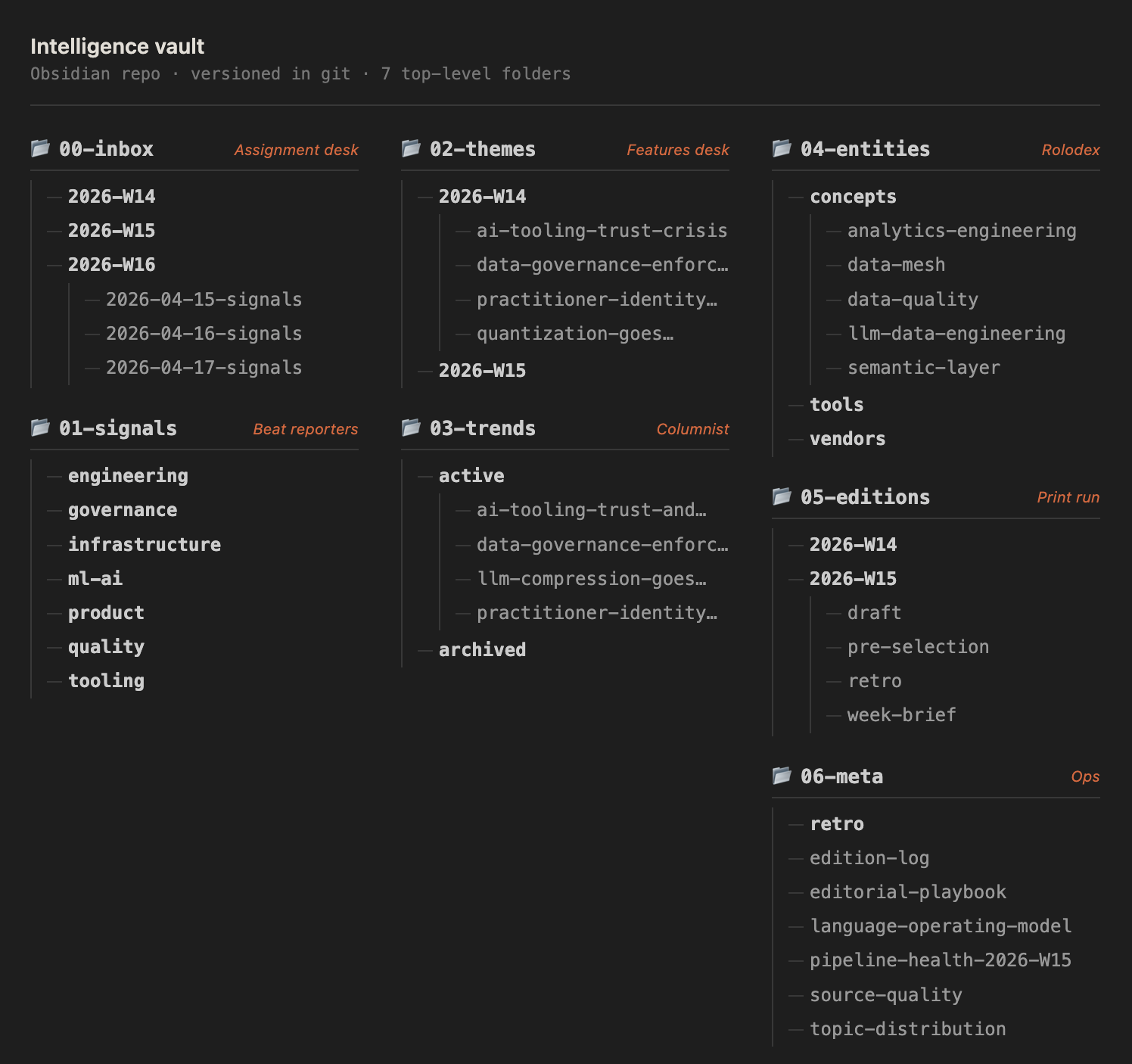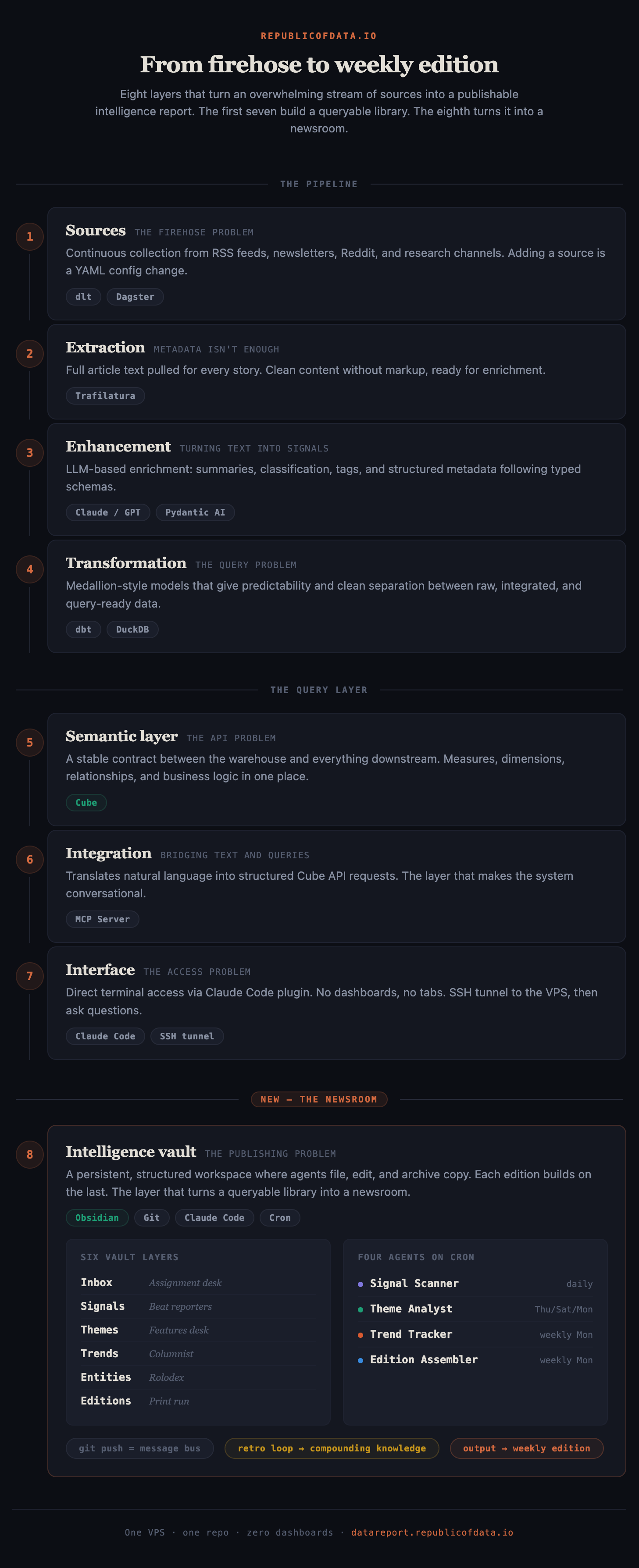 And that's exactly where it stopped being useful for publishing. A chat session is a one-shot. Every query starts clean, nothing persists, nothing accumulates. The pipeline gave me a warehouse I could interrogate on demand, not an edition I could ship every Monday. A weekly edition needs a second layer on top: somewhere to file, edit, cross-reference, and remember. That's what the last few weeks have been about.