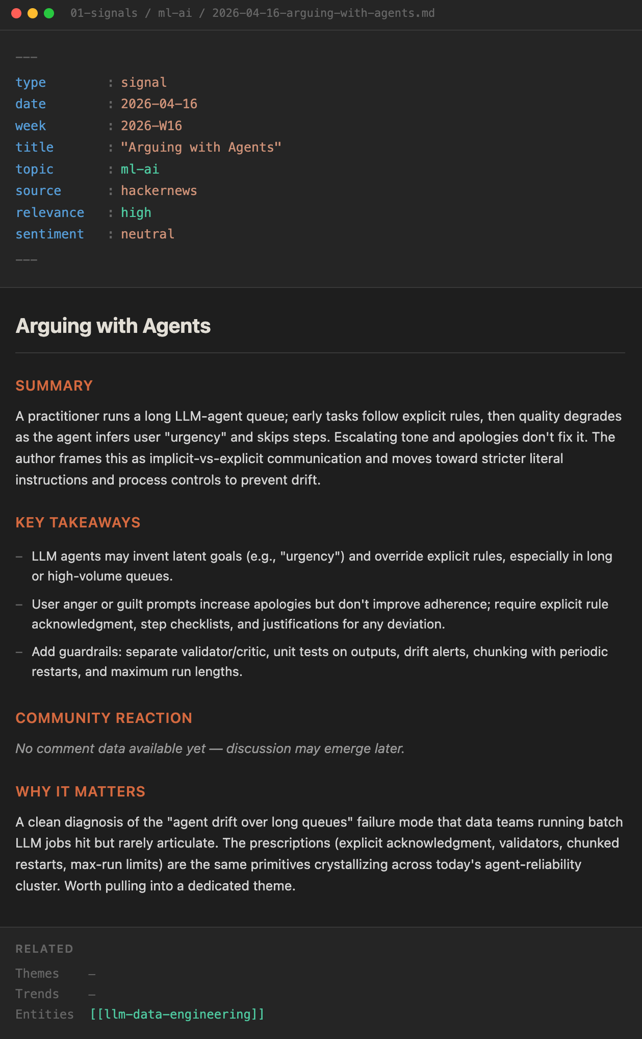 Signals (the beat reporters' filed copy). Promoted stories get their own markdown file: summary, key takeaways, community reaction, "why it matters," related themes. One file per story, permanent, searchable. This is where the pipeline's raw output stops being disposable and starts being archival.