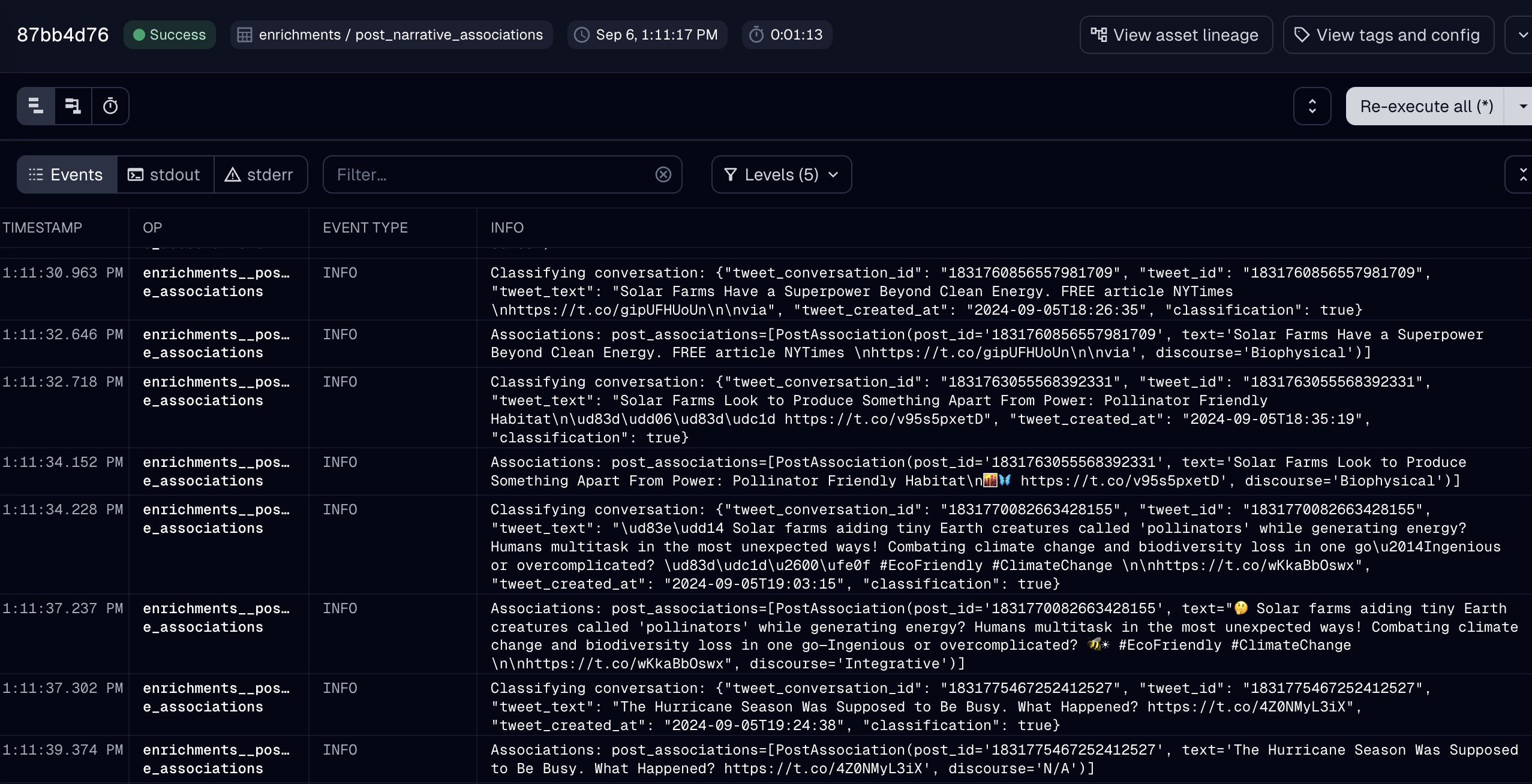We can log the agent's actions when we run an asset that uses an AI agent. Here, we see the structured output of the narrative association performed for each post.