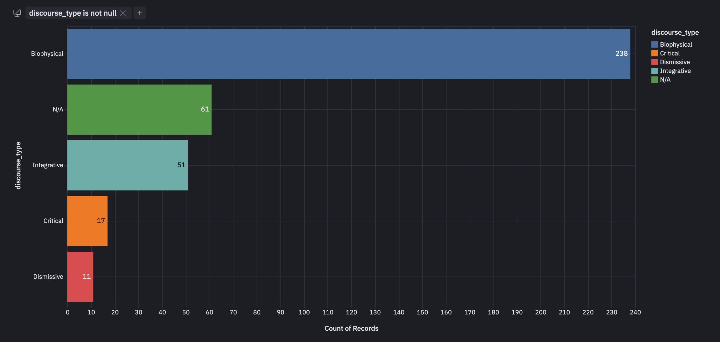We only have a few days' worth of data, but let's see if we can start visualizing discourse types by geography. Let's start by looking at the distribution of discourse types.