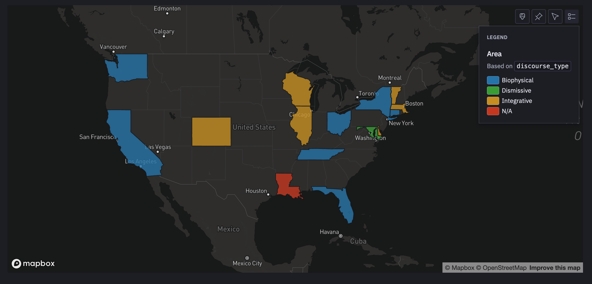 And now let's see a very preliminary map of the dominant narratives by U.S. state.