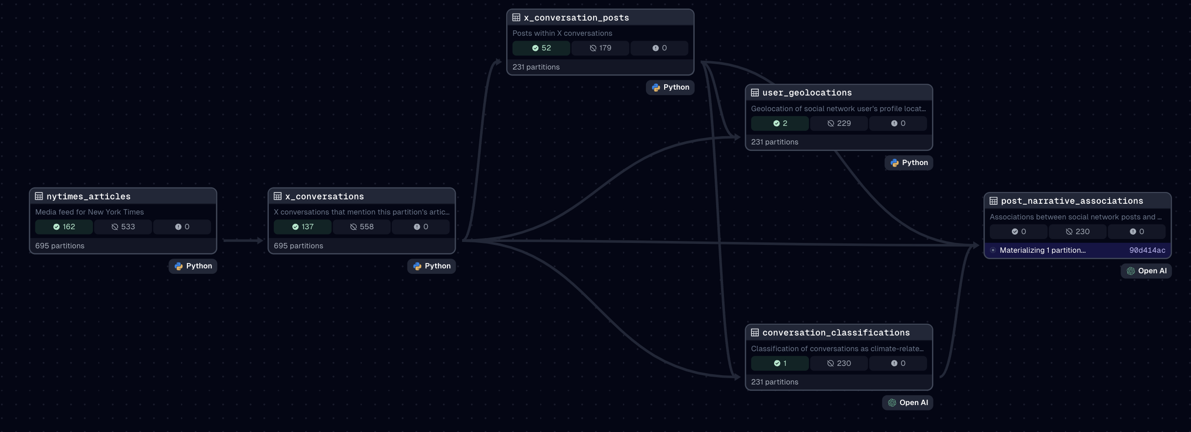 One of the platform's key features is its ability to enrich data using AI agents in the transformation process. For example, we use agents to associate conversation posts with distinct climate discourse types. This allows for a more nuanced understanding of the public perception of climate issues and how those perceptions differ by geography and time.