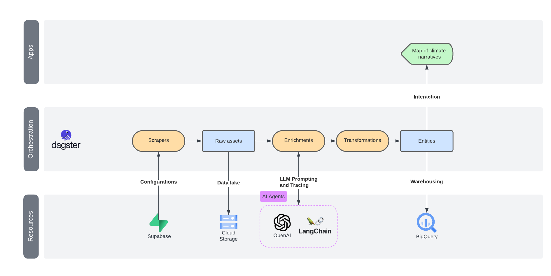 In this post, we will go through how we built a data platform to mine climate-related articles and capture online conversations about those articles. We'll use Dagster, LangChain and OpenAI as the primary resources for this scraping and enrichment operation. Here's what we'll be going through: